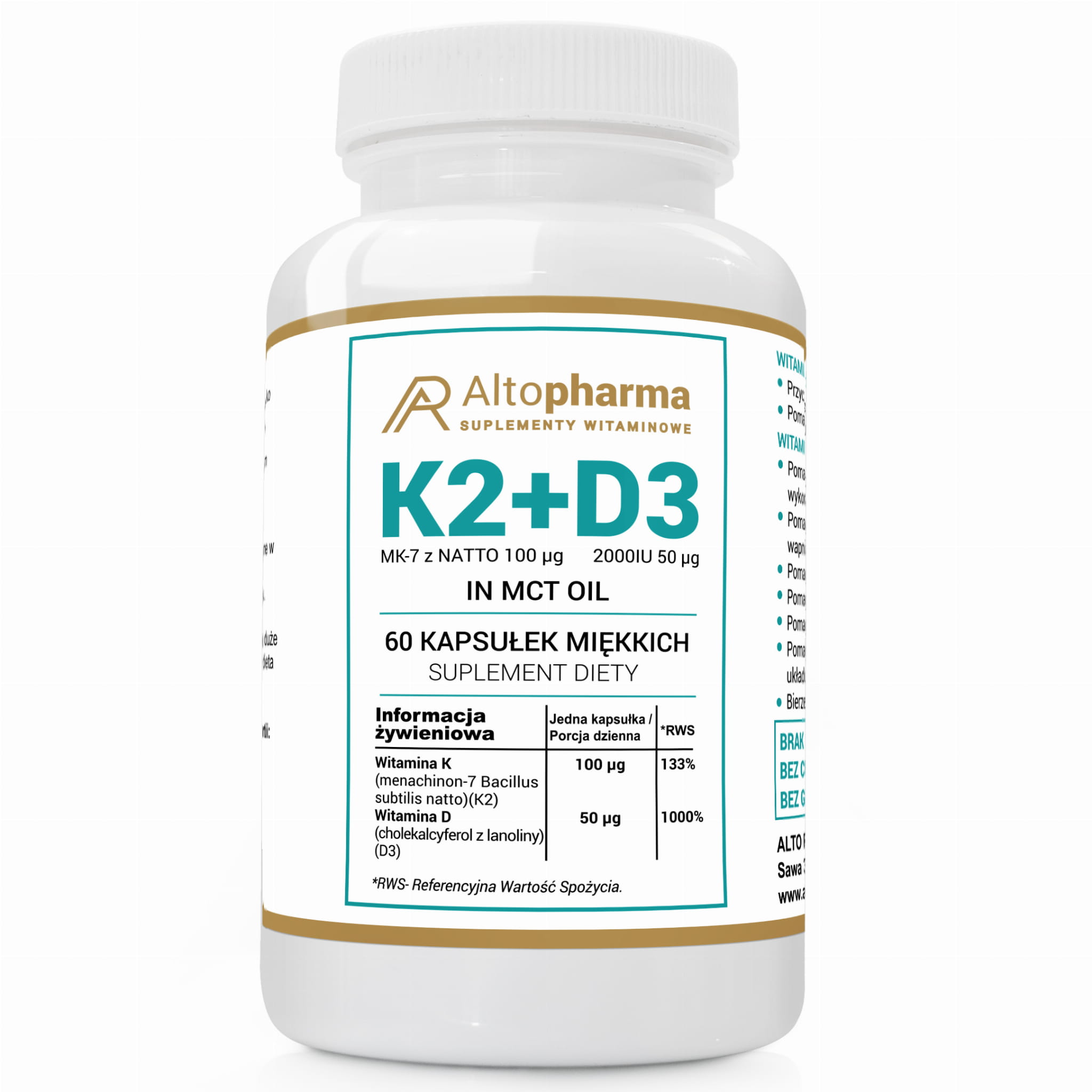 Alto pharma WITAMINA K2 MK7 natto 100µg + D3 50µg 2000IU OLEJ KOKOSOWY in MCT 60 kapsułek miękkich (Softgel)
