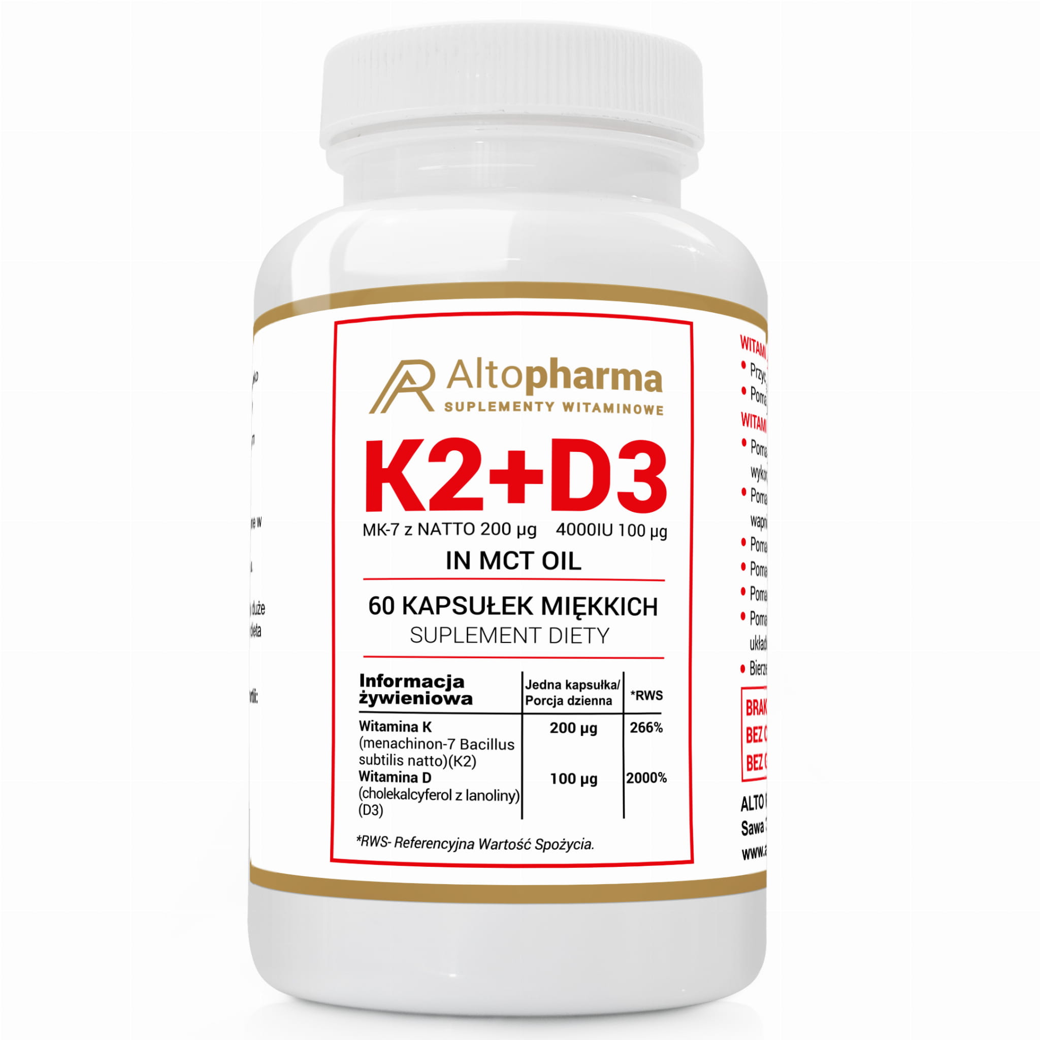 Alto pharma WITAMINA K2 MK7 natto 200µg + D3 100µg 4000IU OLEJ KOKOSOWY in MCT 60 kapsułek miękkich (Softgel)