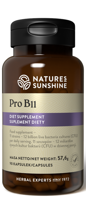 Pro B11 Natures Sunshine to naturalny suplement zawierający żywe bakterie o wielu szczepach o wysokiej mocy, który zawiera prawie 12 miliardów bakterii w jednej porcji. 11 szczepów bakterii zapewnia uzupełnienie jelit różnorodną pożyteczną florą. Każda kapsułka zawiera fruktooligosacharydy i inulinę, wbudowany prebiotyk odżywiający i rozprowadzający bakterie w jelitach.